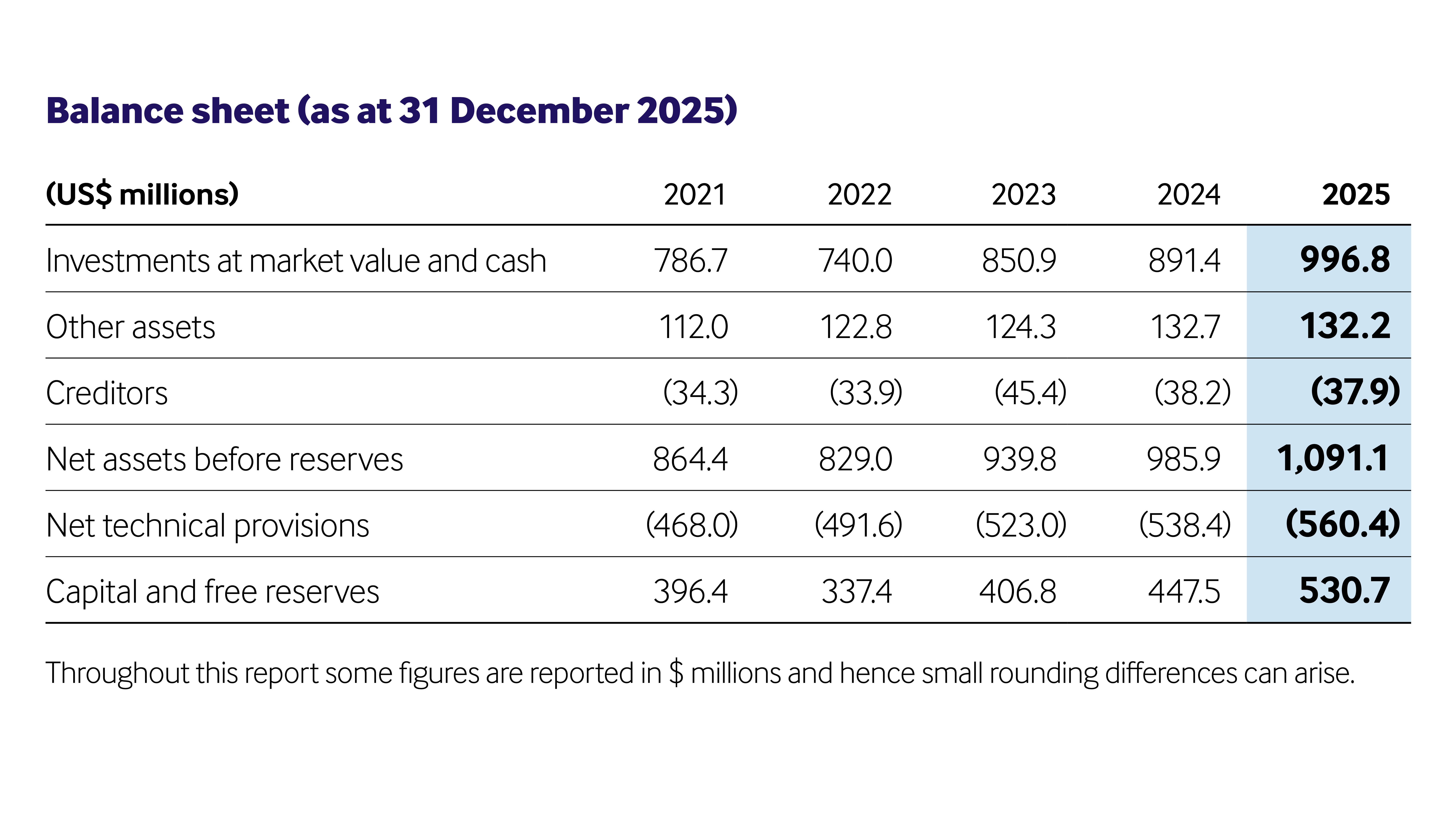 The strong return on the Club’s investment portfolio was a key contributor to year-end net assets reaching US$ 530.7m. This strong capital position, which is reflected in the Club’s A rating (stable outlook) from Standard & Poor’s, leaves the Club well placed to continue to provide high quality, well priced P&I insurance to its Members into 2026 and beyond.